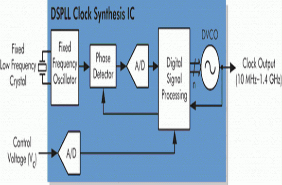 精密CMOS技術(shù)的進(jìn)步提高了電路的速度和運(yùn)算能力,廠商因此能以DSP為基礎(chǔ)發(fā)展出強(qiáng)大的頻率合成組件,并利用它們?cè)O(shè)計(jì)高頻率、低抖動(dòng)的新型石英振蕩器和壓控石英振蕩器。這種把頻率合成組件與固定低頻率石英諧振器結(jié)合在一起的做法既可提供相當(dāng)于傳統(tǒng)石英振蕩器或壓控石英振蕩器的功能,又可在使用者指定的多個(gè)頻率下操作。