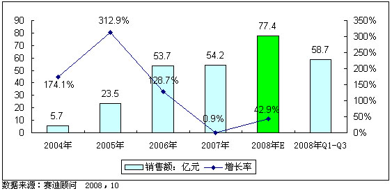 圖2 2004-2008年中國(guó)數(shù)字電視機(jī)頂盒市場(chǎng)銷售額及預(yù)測(cè)