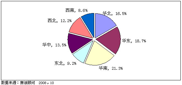圖4 2008年前三季度中國(guó)數(shù)字電視機(jī)頂盒區(qū)域市場(chǎng)銷量結(jié)構(gòu)