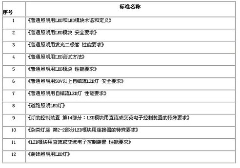 標(biāo)準(zhǔn)的目的在于加強(qiáng)生產(chǎn)的一致性、提升質(zhì)量、并增進(jìn)生產(chǎn)效率,若欲提升LED的制造質(zhì)量,在全球化的競(jìng)爭(zhēng)脫穎而出,標(biāo)準(zhǔn)是一項(xiàng)不可或缺的工具,因此加速對(duì)LED標(biāo)準(zhǔn)的制定是各國(guó)政府及業(yè)界非常重視的問題。2007年在半導(dǎo)體照明標(biāo)準(zhǔn)工作指導(dǎo)委員會(huì)的指導(dǎo)下,由“國(guó)家半導(dǎo)體照明工程研發(fā)及產(chǎn)業(yè)聯(lián)盟”成立“聯(lián)盟標(biāo)準(zhǔn)化協(xié)調(diào)推進(jìn)工作組”,以負(fù)責(zé)協(xié)調(diào)中國(guó)的LED標(biāo)準(zhǔn)進(jìn)度。而目前最新進(jìn)展是由“全國(guó)照明電器標(biāo)準(zhǔn)化技術(shù)委員會(huì)”提出的普通照明用LED國(guó)家標(biāo)準(zhǔn)及行業(yè)標(biāo)準(zhǔn)等10多項(xiàng)標(biāo)準(zhǔn)目前都在送審階段,預(yù)計(jì)于今年陸續(xù)頒布實(shí)施,如表所示。