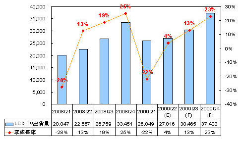 - 全球LCD TV出貨量預(yù)估將從2009年第二季的2,701.6萬臺逐季攀升到第四季的3,740.3萬臺