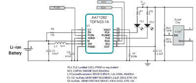 為更好地實現(xiàn)這一目標, AAT1282具有防止啟動時過大尖峰電流沖擊的內(nèi)置電路、一個固定的800mA輸入電流限制器、以及一個超級電容充滿電后的負載斷開電路。其輸出電壓受限于內(nèi)部過壓保護電路,可防止轉(zhuǎn)換器和超級電容免受一個開路LED(開路條件下)的損害。