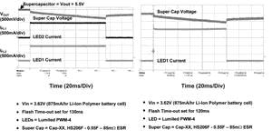 很明顯,不管設(shè)計師在何時使用超級電容,他們都必須限制尖峰電流。此外,當電壓掉到LED閃光燈的工作電壓以下時,超級電容就需要再充電。當超級電容充滿電時,它必須與充電源斷開。另外,它還需要短路保護、源過壓保護和過流保護。