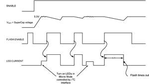 圖3顯示了采用2個以1A電流驅(qū)動的LED閃光燈和1個以2A電流驅(qū)動的LED閃光燈的測試結(jié)果。正如所見到的一樣,超級電容可以很容易地提供閃光持續(xù)120ms所需的電流,同時保持電源電壓充分地高于LED的VF電壓。在兩次閃光之間,超級電容以一個較慢的速率再充電,充電時間在外部設(shè)定,可針對不同的電池尺寸和化學(xué)原理進行優(yōu)化。圖4顯示了閃光功能和電影模式選項的數(shù)字控制。