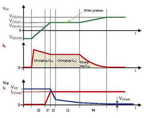 正如IG=f(t)圖所示,導(dǎo)通過程可以分為三個階段。分別是柵極-發(fā)射極電容的充電,柵極-集電極電容的充電和柵極-發(fā)射極電容的充電直至IGBT全飽和。柵極電流IG對輸入電容進(jìn)行充電,IGBT的導(dǎo)通和關(guān)斷特性由與充電過程有關(guān)的電壓VGE和VCE來體現(xiàn)。在關(guān)斷期間,所描述的過程運行在相反的方向,電荷必須從柵極上移除。