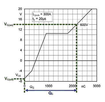 柵極電荷可以通過一個簡化的測試電路進(jìn)行測量。當(dāng)柵極電壓VGE用示波器進(jìn)行測量時,柵極由一個恒流源(QG=I*t)驅(qū)動。所確定的柵極電荷曲線(圖3)可被用來計算驅(qū)動IGBT所需的每脈沖柵極電荷。