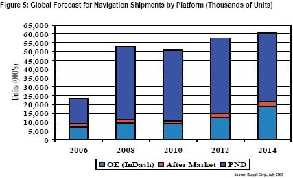 圖5所示為iSuppli公司對于OEM和配件市場的導(dǎo)航出貨量預(yù)測。