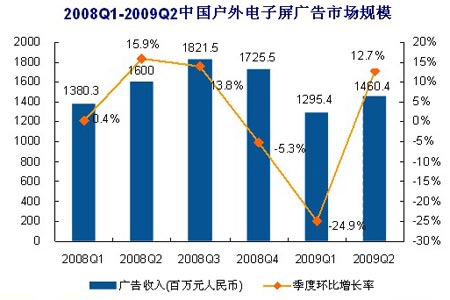 易觀國際分析認為,由于部分細分市場尚未走出宏觀經(jīng)濟下滑的困境,加上整體市場的反彈并不強勁,因此本季度整體市場規(guī)模未達到去年同期的水平,預(yù)計目前中國宏觀經(jīng)濟的好轉(zhuǎn)對戶外電子屏廣告市場的促進作用將在下半年顯現(xiàn)。