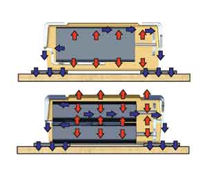 鏡像設(shè)計的另一個好處是改善了其散熱性能如圖4所示,紋波電流在陽極產(chǎn)生的熱量通過PCB板上的引線和鉭絲得以發(fā)散冷卻。