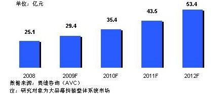 屏幕拼接市場已經(jīng)進(jìn)入快速成長期,據(jù)奧維咨詢(AVC)《中國大屏幕拼接市場研究報(bào)告》顯示,2008年中國市場規(guī)模約為25.1億元,2009年雖然遭遇經(jīng)濟(jì)大環(huán)境的影響,預(yù)計(jì)仍將增長17%左右,市場規(guī)模將達(dá)29.4億元。市場的成長主要得益于國家對能源、交通等基礎(chǔ)建設(shè)的大規(guī)模投入,以及09年全運(yùn)會、10年世博會、亞運(yùn)會等大型賽會事的拉動。