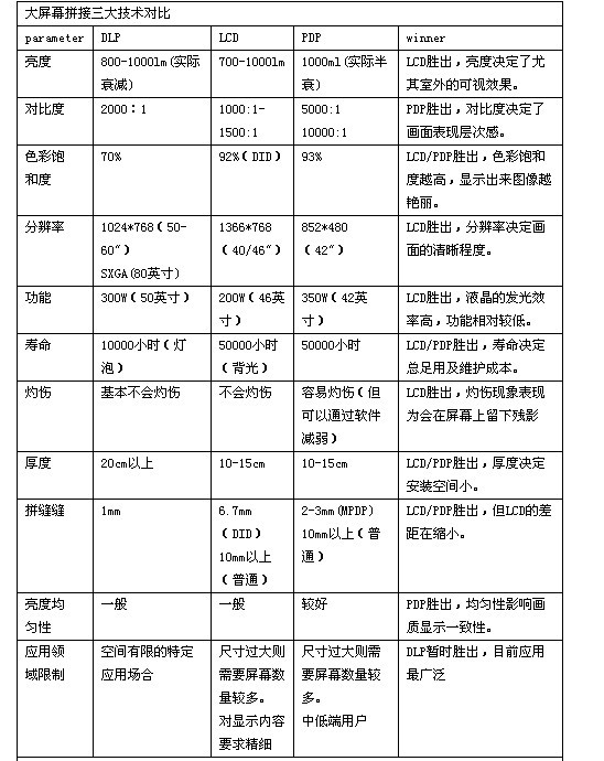 從以下對比表不難發(fā)現(xiàn),從技術(shù)層面來看,LCD技術(shù)占有綜合優(yōu)勢的地位,主要弱勢是拼接縫較寬,而DLP主要優(yōu)勢則在拼接縫最小,在色彩表現(xiàn)、分辨率、壽命等方面都有著較為明顯的缺陷。PDP則在防灼傷、分辨率方面相對較弱。