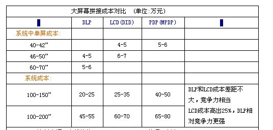 從總體系統(tǒng)分析,100-150”系統(tǒng)中,DLP平均成本為20~25萬元左右,而LCD和DLP的差距已經(jīng)縮小到10萬元以內(nèi),成本競爭力基本相當(dāng)。在150”以上超大拼接系統(tǒng)中,LCD的成本要高出DLP大約25-30%,而MPDP更是要高出30%以上,這一領(lǐng)域DLP的成本競爭力優(yōu)勢比較明顯。