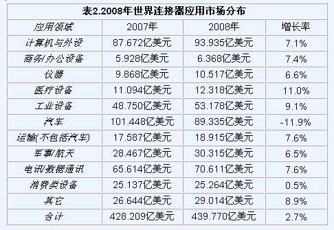 專業(yè)的連接器市場研究公司-Bishop&Associates于2009年4月公布了2008年世界連接器工業(yè)市場數(shù)據(jù),數(shù)據(jù)顯示受世界經(jīng)濟(jì)危機(jī)的拖累,2008年世界連接器工業(yè)銷售增幅急劇下滑,與上一年相比,僅增長2.7%,而2007年的增幅為7.2%,盡管如此,連接器工業(yè)仍然實(shí)現(xiàn)了6年的連續(xù)增長(2003 年11.2%, 2004年17.9%,2005年6.2%,2006年12.6%,2007年7.2%,2008年2.7%),與經(jīng)濟(jì)危機(jī)下其它電子元器件普遍負(fù)增長的糟糕表現(xiàn)相比,這一增長數(shù)字,是令人欣慰的。