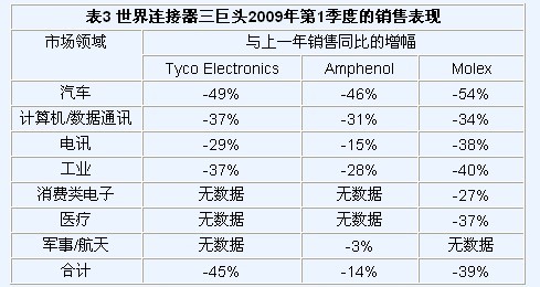 2009年第一季度已經(jīng)過去,連接器產(chǎn)品訂單劇降41.7%,銷售則下挫了35.7%,這兩項(xiàng)數(shù)據(jù)結(jié)果均創(chuàng)下了連接器工業(yè)的歷史新低。在上一次表現(xiàn)最糟糕的2002年第四季度,銷售和定單下降了31.2%。所有最終應(yīng)用市場均報告直線下降,一片蕭條跡象。三家世界最大的連接器公司泰科電子(Tyco Electronics)、安費(fèi)諾(Amphenol)和莫列克斯(Molex)也均報告與上一年同比銷售嚴(yán)重下降,如下表3所示。