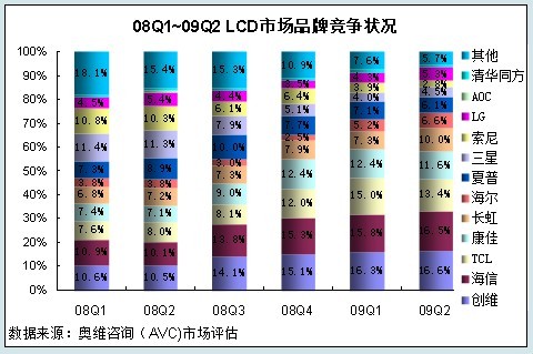 T6陣營(TCL、創(chuàng)維、海爾、海信、長虹、康佳)在2008年,借助“奧運(yùn)攻勢”等活動發(fā)力,并通過產(chǎn)品線的不斷更新定義,終端渠道的投入及價格戰(zhàn)等逐步確立主導(dǎo)地位。但由于受面板價格上升及缺貨的影響,2009年二季度國內(nèi)品牌市場地位容易下滑,S3(三星、索尼、夏普)挾技術(shù)及面板資源攻守兼?zhèn)?,同時LG、冠捷、清華同方品牌也正發(fā)力提升LCD電視市場銷售,市場競爭愈加激烈。