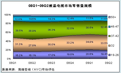 受終端售價快速下降至3000元以內(nèi)及家電下鄉(xiāng)政策因素的拉動,32英寸及以下規(guī)格在LCD零售內(nèi)部比重顯著提升;40/46陣營受42vs40和47vs46均價傾壓及上游面板廠供銷策略的影響,在一季度銷量比重有所下降,二季度比重有所提升。