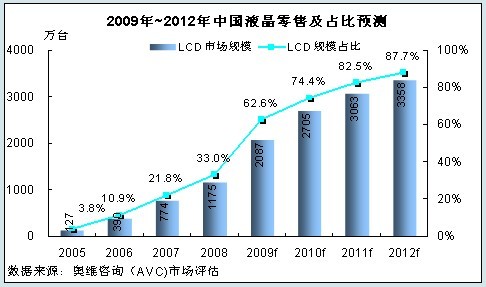 受上半年經(jīng)濟(jì)形勢低迷以及產(chǎn)品替代影響,即使在家電下鄉(xiāng)、節(jié)能補(bǔ)貼、以舊換新三大政策刺激下,2009年全年彩電市場零售量規(guī)模將較2008年下降6.5%。但對于液晶電視來說,則得益于三大政策的刺激,繼續(xù)保持高速增長,預(yù)計全年LCD電視市場國內(nèi)零售量規(guī)模近2100萬臺,出貨規(guī)模可達(dá)2400萬臺,LCD電視市場將占總體市場比達(dá)到62.6%。