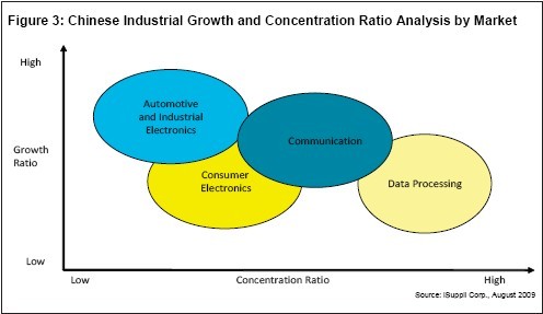 汽車與工業(yè)電子市場具有多樣化與分散化特點。但在中國,未來五年內(nèi),這兩個領(lǐng)域?qū)⑹撬袘?yīng)用領(lǐng)域中增長最快的。工業(yè)高速增長和制造業(yè)集約化程度低,為分銷商提供了許多商業(yè)機會。圖3所示為iSuppli公司對中國工業(yè)增長與集中程度的分析,按市場細分。