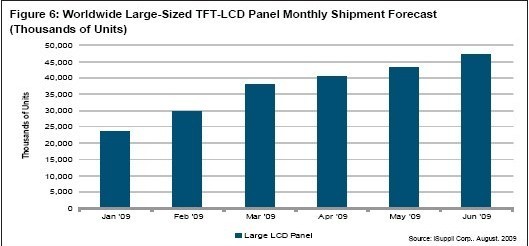 2009年整個(gè)第二季度,全球大尺寸LCD面板出貨量比第一季度上升了43%,比2008年第二季度上升了12%。這應(yīng)歸因于全球經(jīng)濟(jì)好轉(zhuǎn)、中國市場需求旺盛、新型號(hào)的推出、向16:9面板的轉(zhuǎn)變、以及越來越多地使用LED背光技術(shù)。