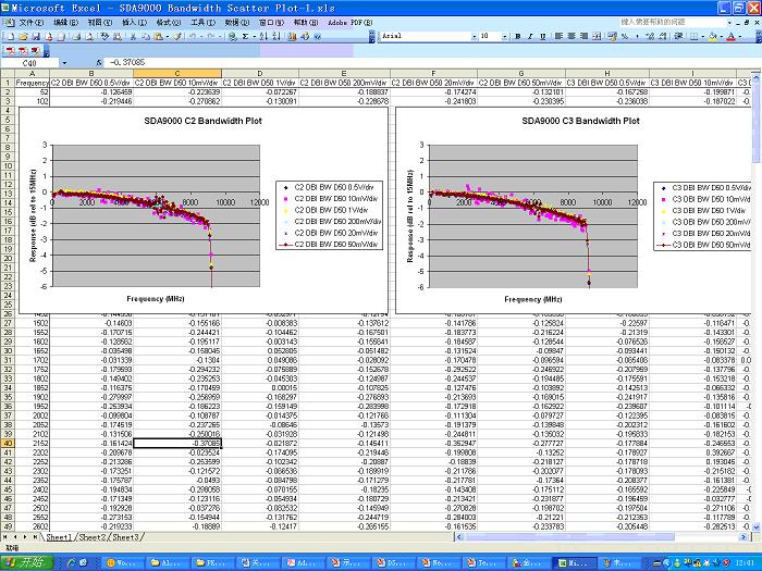 此外,在計(jì)量波特圖時(shí)需要對示波器每個(gè)檔位都進(jìn)行計(jì)量,最終產(chǎn)生的波特圖是所有檔位的結(jié)果疊加在一起的。波特圖的計(jì)量是需要半天時(shí)間完成的,并不是想象中那么輕松的工作。如圖8所示是力科SDA9000的波特圖,我特地將Excel中大量數(shù)據(jù)顯示給大家以使大家對校準(zhǔn)的嚴(yán)謹(jǐn)性有深刻認(rèn)識。 其垂直軸是-1dB/div, 疊加了10mv/div、20mv/div、50mv/div、200mv/div、500mv/div、1v/div等檔位的測試結(jié)果。 很多時(shí)候,我們的競爭對手會把他們的波特圖畫成-10dB/div、只有一個(gè)檔位的測試結(jié)果拿給客戶,并和力科提供的這種-1dB/div、各種檔位疊在一起顯示的結(jié)果放在一起進(jìn)行對比,然后他們告訴客戶,他們的波特圖更平坦,更干凈,甚至將力科波特圖上面密密麻麻的點(diǎn)說成是“噪音”大。這是有點(diǎn)貽笑天下的。 競爭對手敢于一再采用這種做法,這是假設(shè)中國的工程師都沒有辨別力,獨(dú)立思考能力,是對工程師嚴(yán)重不尊重的公然欺騙行為。希望能引起大家注意。