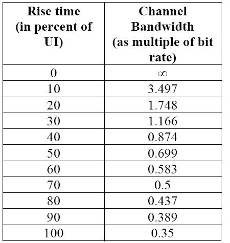 3, 對串行數(shù)據(jù)信號而言,數(shù)據(jù)比特率和上升時(shí)間是最重要的兩個(gè)因素。有一個(gè)非常好的評估準(zhǔn)則是:示波器的帶寬 > 1.8 X 信號比特率. 在這個(gè)準(zhǔn)則下,如果被測信號的上升時(shí)間>20%UI,那么1.8關(guān)系的帶寬能捕獲信號能量的99%. 下面的圖表給出了不同的上升時(shí)間和帶寬之間的關(guān)系。