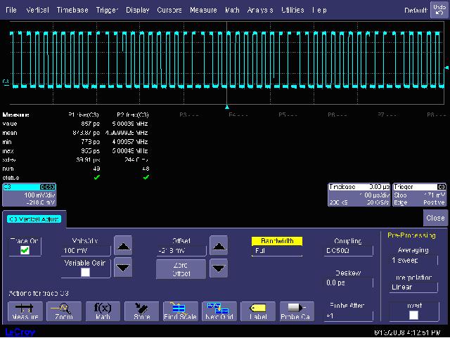 我們知道,帶寬的限制對信號的捕獲會帶來下面的影響:1,使被測信號的上升沿變緩。2,使信號的頻率分量減少。3,使信號的相位失真。 那么,“對于5MHz的時(shí)鐘信號,需要用多少帶寬的示波器來測量?” 這是我在培訓(xùn)時(shí)常問的一個(gè)問題。我很少能得到令我滿意的答案,很少有工程師反問我:“這5MHz的時(shí)鐘信號是方波還是正弦波,如果是方波,其上升時(shí)間是多少?” 我常得到的回答是,“100MHz帶寬就足夠了,示波器帶寬通常是被測信號頻率的3-5倍,100MHz余量很大了。” 圖13顯示了5MHz的方波信號在不同帶寬時(shí)測試出的波形。其中,M1和M2是分別在6GHz和1GHz時(shí)波形,C3是帶寬限制到200MHz的測試結(jié)果。 圖14顯示在帶寬限制到200MHz時(shí)測量出的5MHz的上升時(shí)間均值為本1.70357ns,而圖15顯示的是在6GHz帶寬時(shí)的上升時(shí)間為873.87ps。這表明,對于 5MHz的時(shí)鐘,因?yàn)槠渖仙龝r(shí)間比較快,最好用1GHz以上帶寬的示波器來測量其上升時(shí)間,200MHz時(shí)其上升沿變緩; 1GHz帶寬和6GHz帶寬對于測試800ps的上升時(shí)間結(jié)果幾乎一樣。