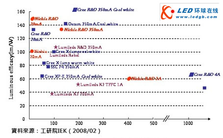2001年標準型白光LED(20mA)發(fā)光效率僅25lm/W,至2009年初Nichia發(fā)表之白光LED,在20mA電流下,其發(fā)光效率可達249lm/W,為目前業(yè)界之最。高功率白光LED(350mA)發(fā)光效率也由2004年約30 lm/W,截至2008年年底Cree發(fā)表161lm/W產(chǎn)品為業(yè)界之最。