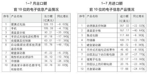 圖一:1~7月出口額(進口額)錢10位電子信息產(chǎn)品情況