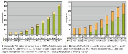 該市場研究公司還表示,雖然PM OLED顯示屏的單位出貨量到2015年將一直增長,但其收入將保持平穩(wěn)。與此同時(shí),AM OLED的單位出貨量將增加兩倍,并將在2011年超過PM OLED的出貨量(圖1b)。