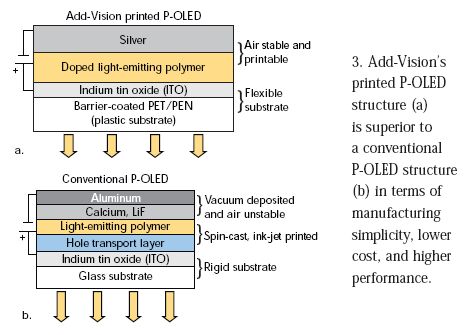 Add-Vision結(jié)構(gòu)采用空氣穩(wěn)定可打印陰極材料,它使低電壓工作、高功效和均勻發(fā)光成為可能。同時(shí),這些材料可在空氣中打印且兼容柔性襯底的低溫處理(見圖3)。[page]