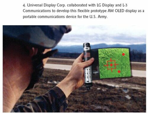 UDC演示了采用AM OLED的4英寸對(duì)角線原型。該原型的制造是UDC聯(lián)合LG Display和L-3 Communications的顯示系統(tǒng)部門一起完成的,它是ASU正在進(jìn)行工作的一個(gè)補(bǔ)充(圖4)。UDC還在進(jìn)行該顯示器觸摸屏版本的研發(fā)。