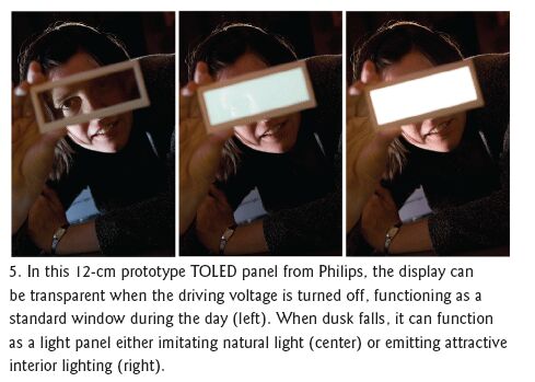 當(dāng)TOLED加電時(shí),它允許光線從兩個(gè)方向穿過。該特性對(duì)頭頂顯示器、光隔柵(白天幾乎看不見了,夜晚則是舒適的漫散光)、氣氛照明、光幕幔、用于導(dǎo)航和預(yù)警系統(tǒng)的汽車擋風(fēng)玻璃以及建筑物的窗戶等應(yīng)用很有用。開發(fā)TOLED的公司包括:歐司朗光電半導(dǎo)體、飛利浦和UDC。原型TOLED預(yù)計(jì)將在一兩年內(nèi)問世。