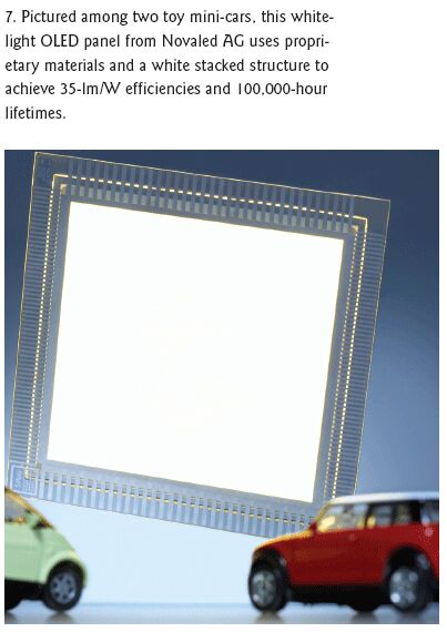 成員之一的歐司朗半導(dǎo)體公司去年展示了一款10×10cm的OLED面板,它在1000cd/m2條件下,具有30至50lm/W的光輸出,壽命為5000小時(shí)。在歐司朗這一工作的中間環(huán)節(jié),還證明了OLED的白光輸出能比以前取得的較低水平有提高。歐司朗采用的是基本的真空沉積技術(shù),使用的是小分子而不是可打印聚合物(圖6)。歸功于與BASF AG的合作,該面板的光輸出后增至60lms/W。