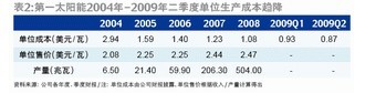 毛利率數(shù)據(jù)同樣顯示,在組件單位售價下降的侵蝕下,第一太陽能的盈利能力幾乎未受到影響。2008年四季度,第一太陽能的毛利率短暫下滑,隨后的兩個季度,毛利率開始反彈,2009年一季度和二季度分別創(chuàng)下歷史新高(表3)。