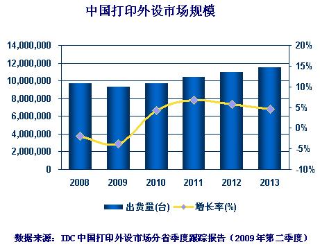北京時(shí)間9月11日中午消息,IDC今天最新發(fā)布的《中國(guó)打印外設(shè)市場(chǎng)季度跟蹤報(bào)告》稱,2009年中國(guó)打印外設(shè)市場(chǎng)相比2008年仍將繼續(xù)下滑,整體市場(chǎng)出貨量增長(zhǎng)率為-3.5%。但是,在未來一段時(shí)期中國(guó)市場(chǎng)發(fā)展仍存在亮點(diǎn)。