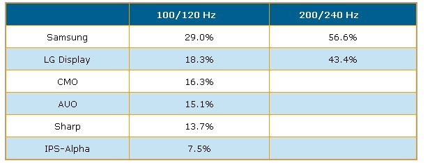 根據(jù)DisplaySearch調查指出,第二季全球采用倍頻及雙倍頻掃描技術液晶電視面板出貨達到640萬片,出貨量市占率達18.3%,較上一季提高2%。以廠商別來看,Samsung以29%市占率居100/120Hz出貨量排名冠軍,LG Display以18.3%是占率居次,CMO(奇美)、AUO(友達)、Sharp與IPS-Alpha分居第三到六名。在雙倍頻面板出貨量方面,主要為韓國二家面板廠商所主導,市占率如表二所示。