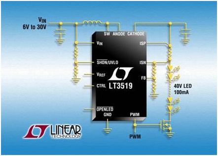 LT3519 在 LED 的高端檢測輸出電流,從而可實現(xiàn)降壓、降壓-升壓或升壓型配置。結(jié)合傳統(tǒng)電壓反饋和獨(dú)特的浮動電流檢測反饋,這些轉(zhuǎn)換器可以作為恒定電壓或恒定電流源工作,從而提供最大的設(shè)計靈活性。其它特點包括:開路 LED 保護(hù)、軟啟動和熱保護(hù)。
