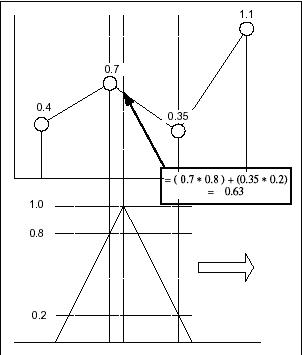 隨著窗口滑到右面,通過把窗口值之和乘以窗口和樣點(diǎn)相交時的實(shí)際樣點(diǎn)值,得到內(nèi)插點(diǎn)。內(nèi)插的樣點(diǎn)放在窗口頂點(diǎn)時間上。