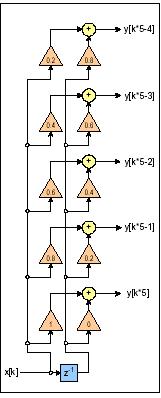 通過使用過采樣排列的數(shù)字濾波器,也可以實(shí)現(xiàn)這種卷積。圖中所示的排列是一個5點(diǎn)過采樣器。在這一排列中,每個新樣點(diǎn)都生成5個新樣點(diǎn)。濾波器輸出僅與新輸入和最后一個輸入有關(guān)。濾波系數(shù)通過對窗口采樣生成。