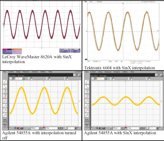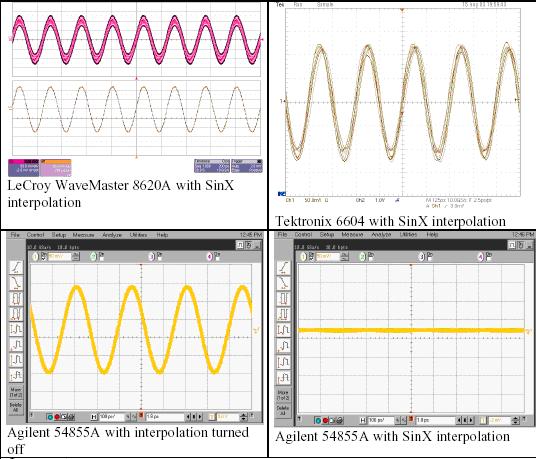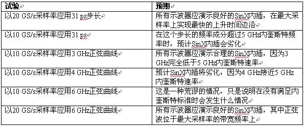 我們使用三種競爭的DSO進(jìn)行簡單的試驗(yàn),其分別是力科Wavemaster 8620A、泰克6604和安捷倫54855A。這三種示波器的帶寬指標(biāo)都是6 GHz,最大采樣率是20 GS/s。我們使用六種不同的信號和采樣率組合,說明SinX內(nèi)插算法的性能。