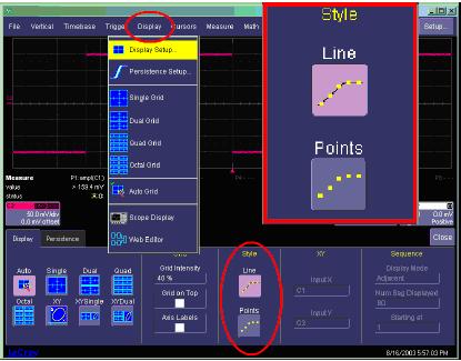 顯示畫面可以設(shè)置成只顯示點(diǎn)或直線。在選擇點(diǎn)時,將只顯示波形點(diǎn),包括任何內(nèi)插的點(diǎn)。在選擇直線時,會在每個波形點(diǎn)之間畫一條直線,僅包括顯示畫面上內(nèi)插的點(diǎn)。