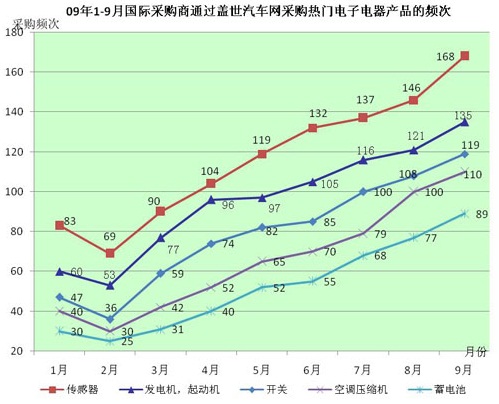 與此相對應(yīng),據(jù)全球領(lǐng)先的專業(yè)汽車零部件電子商務(wù)平臺—蓋世汽車網(wǎng)的統(tǒng)計(jì)數(shù)據(jù)顯示,09年2-9月,國際采購商通過蓋世汽車網(wǎng)采購的汽車電子電器產(chǎn)品均呈現(xiàn)出大幅度增長之勢(如下圖所示)。其中,熱門采購產(chǎn)品主要有傳感器、發(fā)電機(jī)/起動機(jī)、開關(guān)、空調(diào)壓縮機(jī)、蓄電池等,平均每月采購頻次分別為120、100、82、 68、54以上。與2月份相比,9月份熱門采購產(chǎn)品的采購量增長幅度均達(dá)2-3倍。