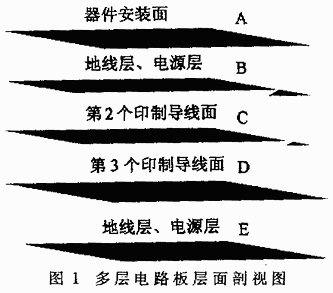 采用多層布線方式,電源、地線和信號分別占有獨立的層面(如圖1所示),這樣由整個層面構(gòu)成的電源線和接地線阻抗相當?shù)?。電路板的分布電容由各層之間的距離和介電系數(shù)來決定,約為10~1000pF/cm2。圖1中的E層上下表面經(jīng)過絕緣處理,既能預防線路板向外輻射噪聲,又能防止線路板接受外來噪聲;同時,電源線被密封在板內(nèi),幾乎不接受任何外來噪聲,而且內(nèi)部幾個供電面之間有很大的靜電電容,形成阻抗極低的供電線路,極大地提高了抗噪性能。