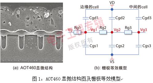 通常從外部來看,MOSFET是一個(gè)獨(dú)立的器件,事實(shí)上,在其內(nèi)部,由許多個(gè)單元(小的MOSFET)并聯(lián)組成,圖1(a)為AOT460內(nèi)部顯微結(jié)構(gòu)圖,其內(nèi)部的柵極等效模型如圖1(b)所示。MOSFET的結(jié)構(gòu)確定了其柵極電路為RC網(wǎng)絡(luò)。