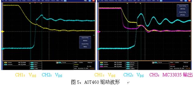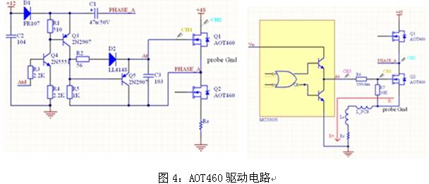 圖4是電動(dòng)車控制器的兩種驅(qū)動(dòng)MOSFET管AOT460驅(qū)動(dòng)電路,分立器件驅(qū)動(dòng)時(shí),PWM在上橋臂,直接用MC33035驅(qū)動(dòng)時(shí),PWM在下橋臂。