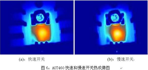 圖6為AOT460在同一應(yīng)用中快速開關(guān)和慢速開關(guān)情況下的熱成像照片??梢钥闯觯诼匍_關(guān)情況下MOSFET的局部溫度要高于快速開關(guān)情況下的溫度,過慢的開關(guān)速度會(huì)導(dǎo)致MOSFET因局部溫度過高而提前失效。