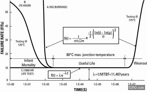 第1個區(qū)段描述了裝置的失敗率。只要在生產裝置中進行若干測試,就可以把故障率降低到一個在實際運行中可以接受的水平。第2個區(qū)段描述了實際工作壽命中有可能出現(xiàn)的隨機故障。它們與時間無關,有關裝置也不會預先替換,一般都會在發(fā)生故障時才會被替換。第3個區(qū)段顯示了裝置的壽命接近終結而開始出現(xiàn)損耗。假如不加以替換,有一半產品都會在壽命中期開始失效。