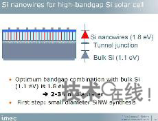 • IMEC的目標是實現(xiàn)在硅底板上形成硅納米線的太陽能電池,轉(zhuǎn)換效率將達到約33%