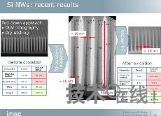 目前,IMEC正在嘗試試制適于太陽能電池的硅納米線。要實現(xiàn)1.7~1.8eV的帶隙,硅納米線的直徑需要降至2~4nm。為形成這種極細的硅納米線,IMEC采用了為制造新一代半導(dǎo)體而開發(fā)的EUV曝光。