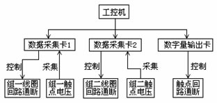 需要注意的是,當(dāng)觸點(diǎn)電壓為交流信號(hào)時(shí),為了保證電壓有效值的計(jì)算精度,采集卡在一個(gè)工頻周期內(nèi)要完成16個(gè)采集通道至少320次的AD轉(zhuǎn)換,這就要求采集卡的采集速率非???,本裝置采用的是研華的PCL-818HG。每塊采集卡還提供了一個(gè)20-PIN數(shù)字輸出口,用來控制試品線圈回路的通斷電。試品觸點(diǎn)回路采用一塊多通道的數(shù)字量輸出卡,通過固態(tài)繼電器實(shí)現(xiàn)對(duì)兩組試品觸點(diǎn)回路的通斷電控制。繼電器可靠性檢測(cè)裝置的結(jié)構(gòu)框圖如圖1所示。